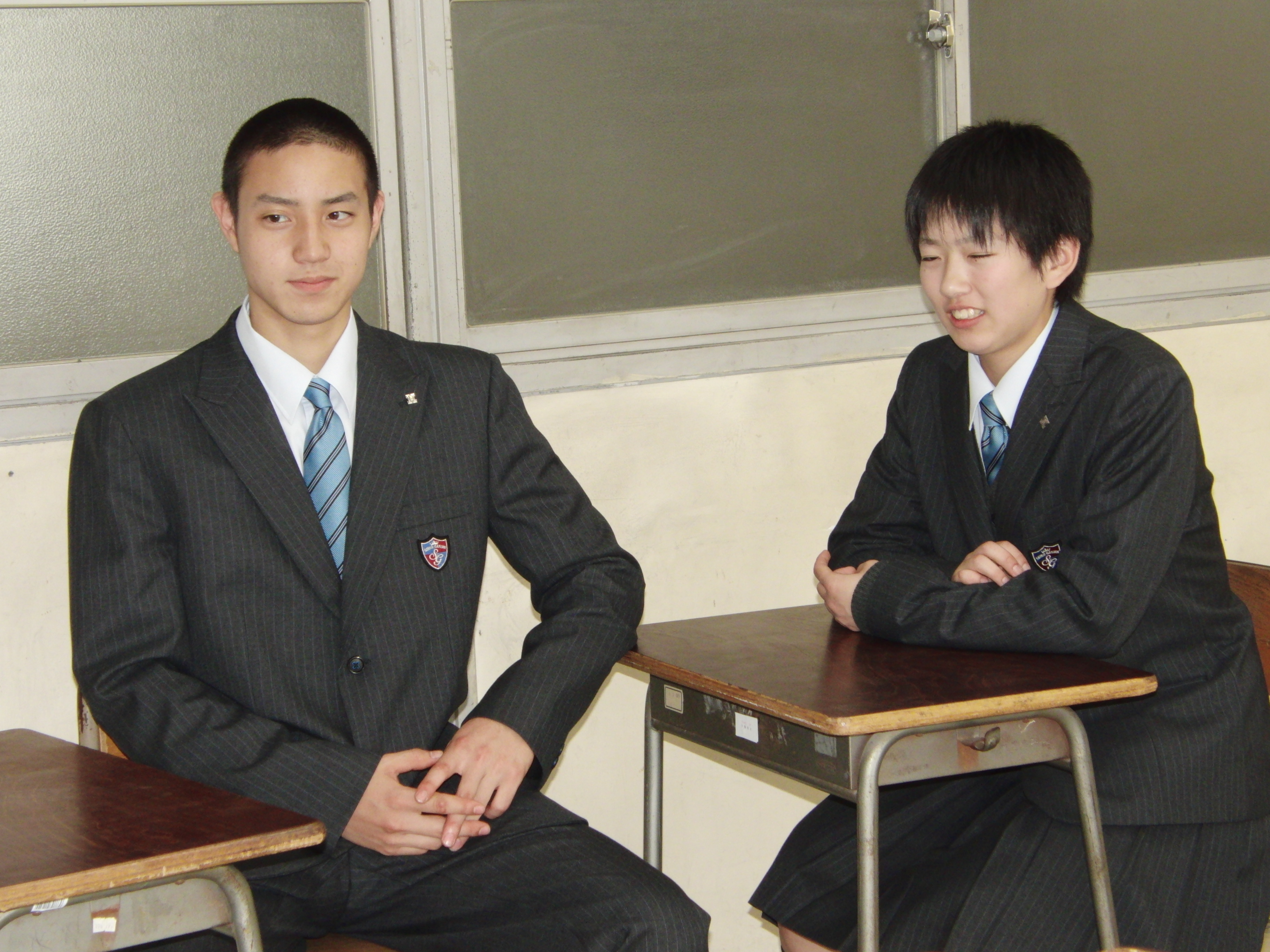今年のモデルは3年普通科進学コースの新井怜治君(大井西中卒)、伊藤周平君(大鳥中卒)、山地いずみさん(福島第四中卒)、2年普通科進学コースの三瓶詩織さん(清水中卒)の4名。新井君はサッカー部、伊藤君は剣道部、三瓶さんは女子バレーボール部で活躍し、山地さんは去年に続く2年連続の登板!!